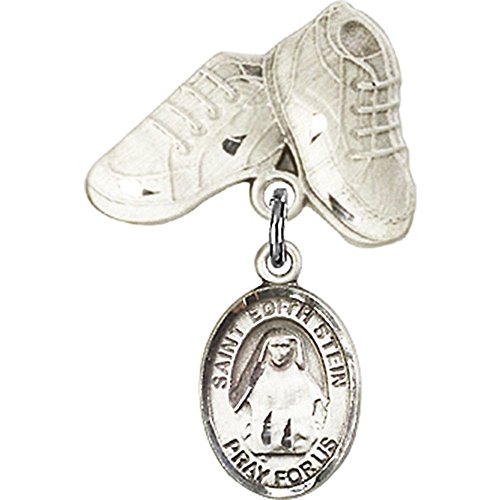 -. Title : Sterling Silver Baby Badge with St. Edith Stein Charm and Baby Boots Pin 1 X 5/8 inches