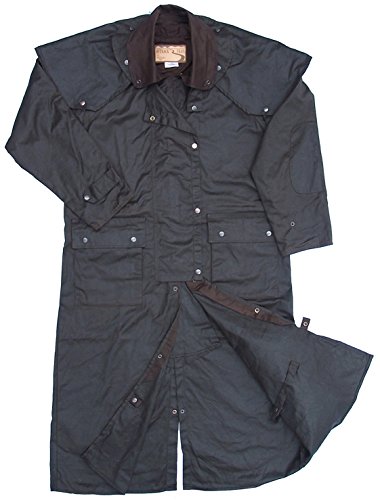 Binding : Apparel Product Description The Outback Trail Snowy River Riding Coat is made from hight quality heavyweight waxed cotton, with traditional Australian riding coat features. It has a detachable shoulder cape with straps, storm front closure, leg straps, fantail back, adjustable cuffs and extra layer of fabric on sleeve forearm for water protection. It has two outside patch pockets with handwarmer pockets underneath. The coat has a cotton lining with an inside pocket. It has a drawstring waist for adjustment. 0