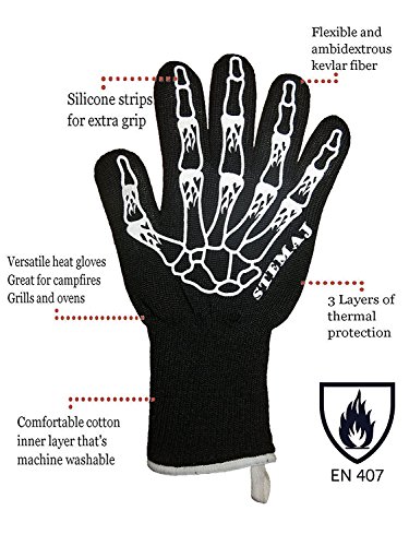 - ⭐ THE HIGHEST QUALITY AVAILABLE THAT YOU DESERVE! Stemaj Utilizes a 3-layer military grade, Para-Aramid Synthetic Kevlar construction, this A+ Grade heat resistant material is commonly found in Firefighter Suits. Heat resistant gloves are certified by EN407 at 932°F. NO MORE BURNS WITH HEAT RESISTANT MILITARY GRADE KEVLAR.