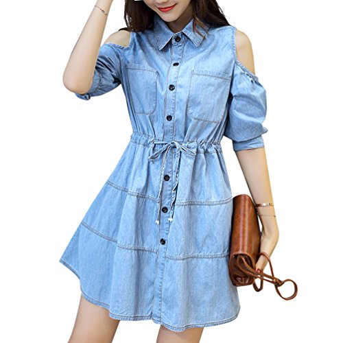 -. Title : (ライチ) Lychee レディース デニムワンピース 肩出し オフショルダー ウェストにギャザー入り リボン付き 薄手 ドレス 角襟 半袖 通勤 デート ストリート