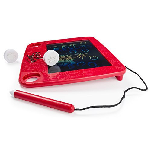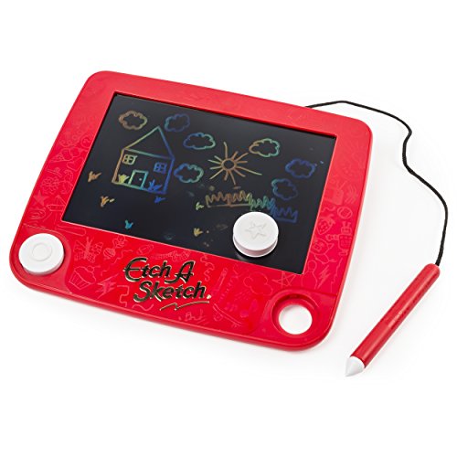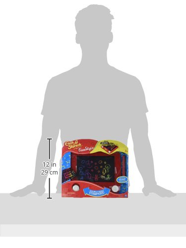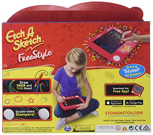 The next generation has a new classic to play with! Introducing Etch A Sketch Freestyle: a toy from the past transformed for the future. Designed exclusively for young artists, the Freestyle comes with a handy stylus that’s easy to grip and move. Kids can express their creativity without any messy clean up. Simply draw, shake to erase, and draw again – just like you did! Only now, your child has a whole new world of etching possibilities to discover. Alternate between thick and thin lines or use the double-sided stampers to add hearts, circles, stars and clouds to doodles. Since inspiration can strike anywhere, the classic red frame of the original has been flattened into a sleek and lightweight drawing pad. Throw it in a backpack and take it on a trip! Get creative, wherever you are, with the Etch A Sketch Freestyle!Feature