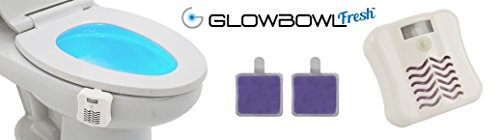 GlowBowl Fresh Now comes with a built in Air Freshener. This is the next generation of toilet lights. We have redesigned for a longer lasting light. We guarantee it is the highest quality toilet light on the market. GlowBowl Fresh will change your night time bathroom visits forever. No more missing your target or stumbling around in the dark - the GlowBowl Fresh is motion-activated and light-sensitive. With the touch of a button, you can choose from 13 different colors: Blue, purple, aqua, yellow, red, white or green. With the GlowBowl Fresh, you no longer need to worry about turning on the blinding light again. The GlowBowl Fresh dimming feature allows you to further customize it by selecting the level of brightness you desire. From a nice subtle glow to a brightness that radiates beyond the bowl great gift idea for the person that has everything. Our patented design allows you to create a snug fit on any toilet in seconds that will stay in place forever.Feature
