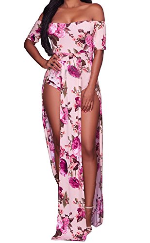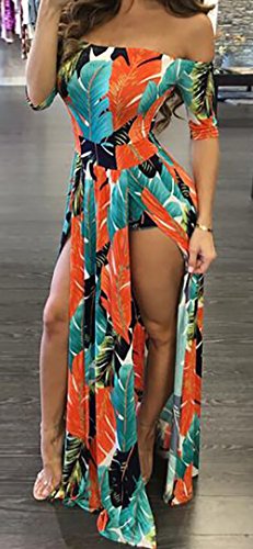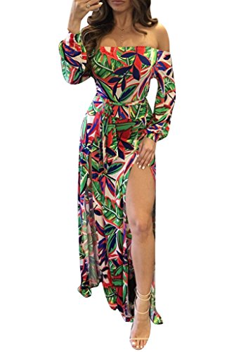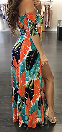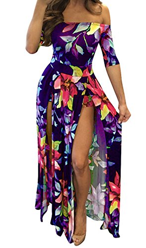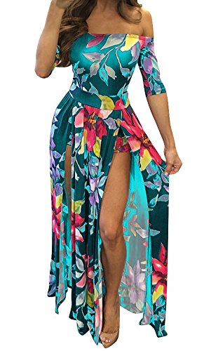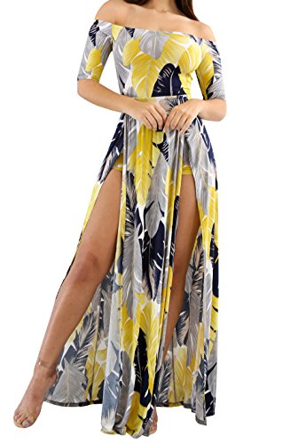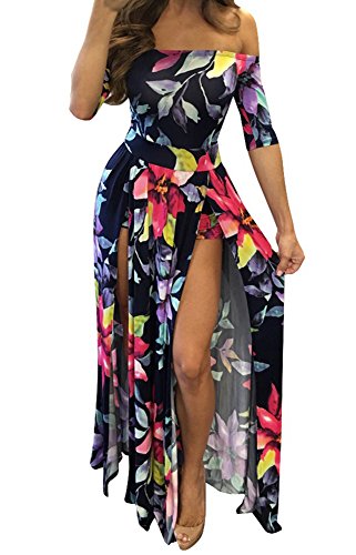 Stretchy dress has a smooth, snug fit with off shoulder neckline, half sleeved and dramatic split from waist to the floor