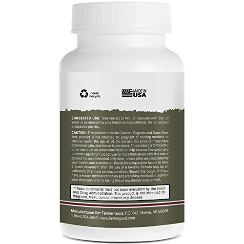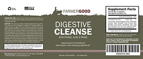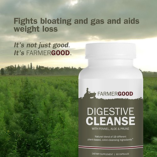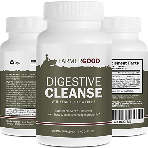-. Binding : Health and Beauty -. Brand : Farmer Good -. EAN : 0798753088887 -. Feature : NATURAL COLON CLEANSING: Our formula offers a natural blend of 19 different plant-based ingredients, such as fennel, aloe and prune. / PROMOTES HEALTHY DIGESTION AND BOOSTS IMMUNITY: Colon-cleansing products are often used as a part of weight-loss diets. Unlike laxatives, this highly-potent cleanse has a powerful and, yet, gentle detoxifying effect on the stomach without the harsh chemicals. / TRUSTED INGREDIENTS: All Farmer Good products are manufactured in an FDA-registered facility right here in the U.S.A. and follow all GMP guidelines. We use 100% pure, all-natural ingredients. / EASY TO SWALLOW: Comes in easy-to-swallow gelatin capsules. / 100% MONEY-BACK GUARANTEE: If you are not happy with your results after taking our supplement as directed, return the unused portion in the bottle within 30 days for a full refund. Click the ADD TO CART button to order your risk-free bottle today! -. IsAdultProduct : 0 -. Label : Farmer Good -. LegalDisclaimer : These statements have not been evaluated by the Food and Drug Administration. This product is not intended to diagnose, treat, cure or prevent any disease. -. Manufacturer : Farmer Good -. PackageQuantity : 1 -. ProductGroup : Health and Beauty -. ProductTypeName : HEALTH_PERSONAL_CARE -. Publisher : Farmer Good -. Studio : Farmer Good -. Title : Digestive Cleanse, Plant Based Supplement for Colon Cleansing Detox with 1800mg Natural Blend of Fennel, Aloe & Prune, 30 Day Supply of 60 Easy to Swallow Capsules, Enhance Your Digestion Health Now! -. UPC : 798753088887