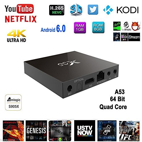 -. Feature : The newest powerful Amlogic S905X chipset (Quad-core Cortex A53 2.0GHz),64bit Mainstream CPU,1GB+8GB(Expandable storage up to 128GB),run faster and more stable, supports 4k Ultra/HD High-definition 1080P stream /H.265(HEVC)/VP9/WiFi/ / KODI 16.1 pre-installed,connects your TV & LCD monitor to the world of online entertainment, you could enjoy thousands of movies from Navix,Netflix, Genesis, Phoenix. Also you could play massive android games in the large screen smoothly / Perfect run android 6.0 operating system, you could add and delete application easily / Supports 3D film, DLNA play, or play media from storage device like memory card, USB drive. Built in 2.4G WiFI, supports Airplay and HDMI 2.0A / We could provide 12 months of free warranty, any question we will respond in 24 hours