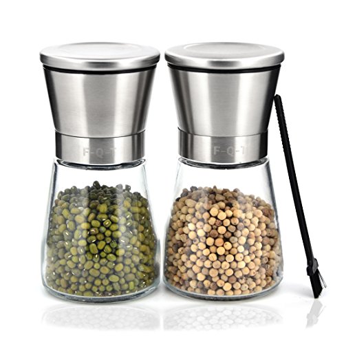 Pepper Mill and Salt Shaker Set Stainless Steel Pepper and Salt Mill Sets with Adjustable Coarseness & Cleaning Brush by F-Q-T (2 pieces)