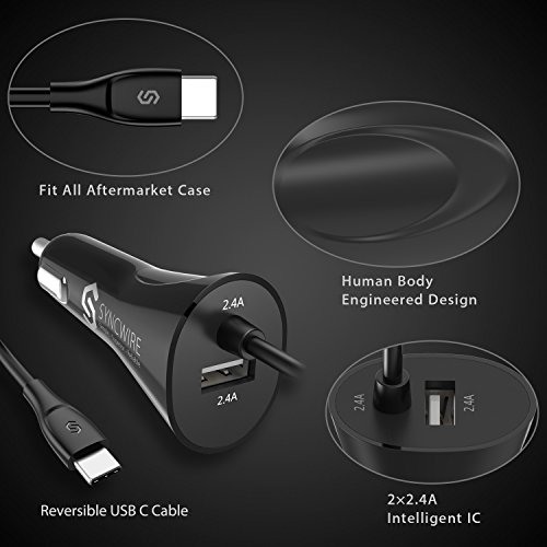 -. Feature : i-Smart Design: The combination of USB Type-C cable and additional USB port allows Syncwire car charger charge any two devices simultaneously with max up to 4.8A output, and it automatically adapts the output to each one accordingly. Moreover, the internal new intelligent chip can ensure 90% high-efficiency charging. / Perfect Compatibility: Compatible with any tablets, smartphones with Type-C connector including Apple New Macbook, ChromeBook Google Pixel/Pixel C, Samsung Galaxy S9/S9+/S8/S8+, Nexus 5X / 6P, OnePlus 2/3T, HTC 10/U11, Sony Xperia XZ, Lumia 950 / 950XL, LG V20/G5/G6, HP Pavilion X2, ASUS ZenPad S 8.0, Nintendo Switch, GoPro5 etc. Moreover, the additional USB port is suitable to charge any of your other devices like Apple iPhone X/8/8 Plus 7/7 Plus and more. / Clever Built-in Type C cable: The cable can extend to 1.2m if pulled tightly while it naturally extends to approximately 0.2m, with 3000+ shape retention! And it is designed to fit all aftermarket cases & accessories. Type C cable has 56KΩ pull-up resistor to provide safe charging for your device. / Advanced Certification: Approved for CE & FCC Certification. Syncwire iPhone car charger is suitable for all vehicle models with DC 12-24V input. No interference issues with Radio, Bluetooth or Wi-Fi. / Lifetime Reliability: The sturdy Polycarbonate shell, the built-in "Smart IC" & the thermal material design keep the car adapter going against overheat and over-load on the unit and over-charge onto the devices. The white LED indicator tells you that Syncwire car charger is ready for charging!