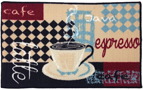 Gourmet Club Printed Kitchen Rug, Coffee, is perfect for you or your favorite coffee lover. The café themed floor mat features blue and browns surrounded by a beige trim. Playful coffee cups are stacked in front of a striped background framed besides coffee expressions in multiple fonts. The bottom of this 18x28 inch floor mat features a latex rubber layer for a sturdy grip on flat surfaces. It is machine washable and the polyester top layer makes for easy spot cleaning. Bring the coffee house feel to any room in your house today.Feature