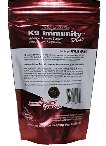 -. Feature : K9 Immunity Plus the most effective insurance you can use to keep your dog healthy! 100% Made in America. This is cutting-edge 21st century science at its best! Start today and enjoy a longer, healthier and happier lifetime with your best friend! / K9 Immunity PlusTM is an intense immune-boosting daily supplement designed to provide maximum support for dogs with cancer. / This formula includesTransfer Factors and Increases the formula's effectiveness and results. The immune-active polysaccharides in K9 ImmunityTM work by bonding with your dog's immune proteins. / Certified Organic K9 ImmunityTM Immune-activating Polysaccharide Blend 600 mg,Aps 40TM Beef derived Immuno-protein concentrate 160 mg,Omega 3 Concentrate from Fish Oil 400 mg