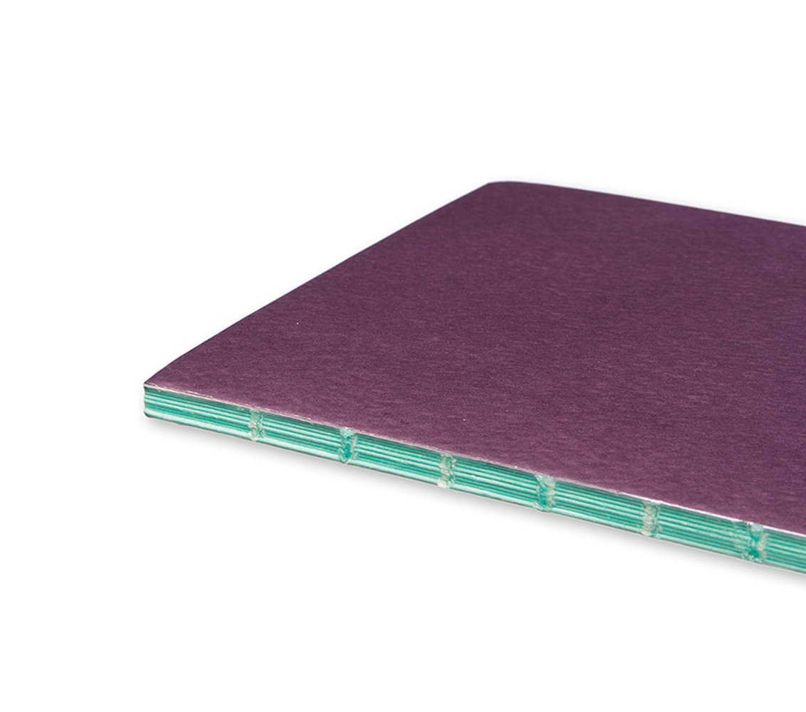 With textured cover, subdued color pallette and external stitched binding
