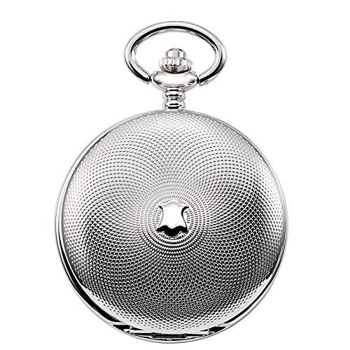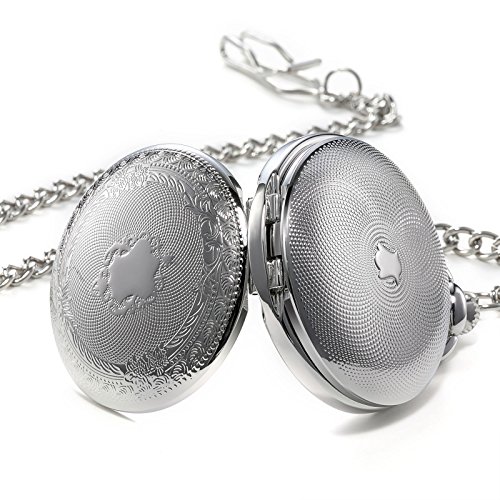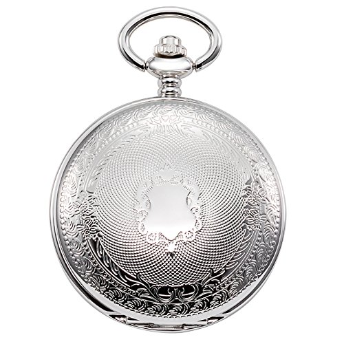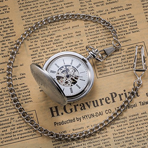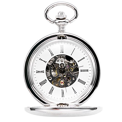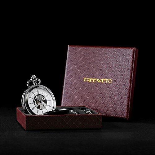 -. Feature : 1. Classic Design: This classic double open collection pocket watch has a sleek silver-tone finish to complement the white skeleton dial and black Roman numeral indicators. The pocket watch can also double as a desk clock with its two covers allowing the watch to stand uP.R.Ight on a desk. / 2. Good Workmanship: Precise jewel mechanical movement,means flawless attention to time.17-jewel mechanical hand-wound movement with an eye-catching skeleton dial and roman numerals,looks retro and elegant. / 3.Manual Movement: Power this watch by manually winding the crown, which tightens the mainsP.R.Ing and stores energy in order to keep the movement running smoothly. Estimated power reserve for this movement is 24 hours, hand wind the watch daily to maintain accuracy. / 4.Unique Packaging£ºThis double cover skeleton pocket watch includes a 14 inch steel curb chain that can attach to your belt loop, and come with unique TREEWETO brand gift box. / Gift for Special Days: this timepiece is best gift to record wedding day or valentines-day for your love, Christmas present for son or grandson, anniversary gift on father¡¯s day, cool birthday gift for bosom friend, graduation gift for the beloved, a great souvenir for anyone, even a perfect decoration for room. This cool pocket watch is no doubt a perfect good stuff on everyone¡¯s shopping list or wish list.