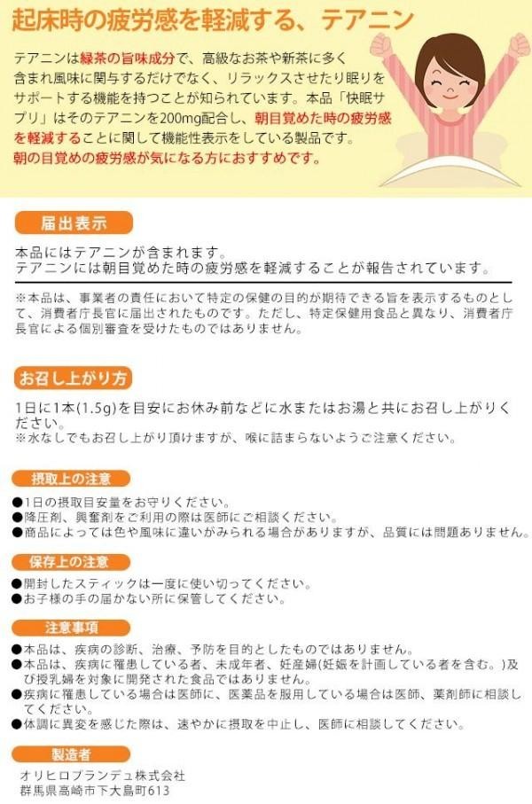 | 栄養成分 | 【1日目安量1本(1.5g)あたり】 熱量:6kcal、タンパク質:0.22g、脂質:0g、炭水化物:1.27g、食塩相当量 0~0.01g ラフマ抽出物:10mg、GABA(γ-アミノ酪酸):5mg 【機能性関与成分:1日目安量1本(1.5g)あたり】 テアニン:200mg |