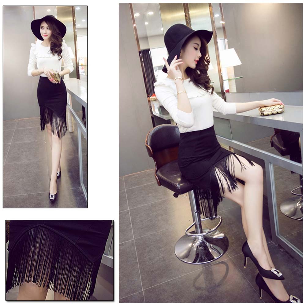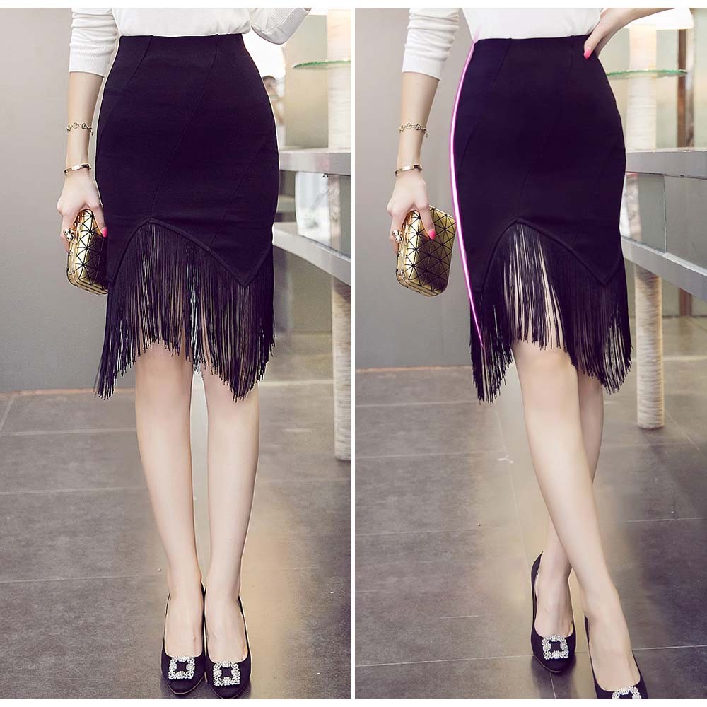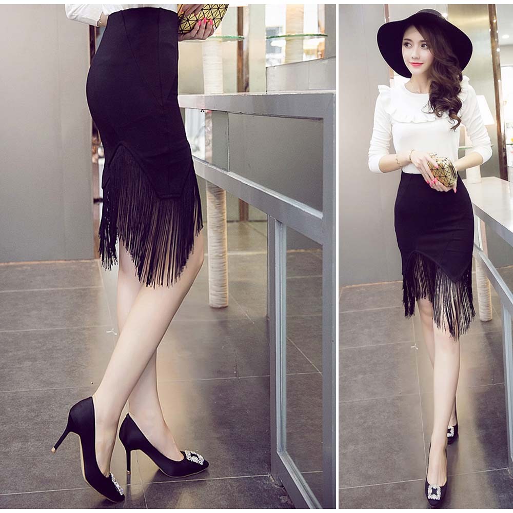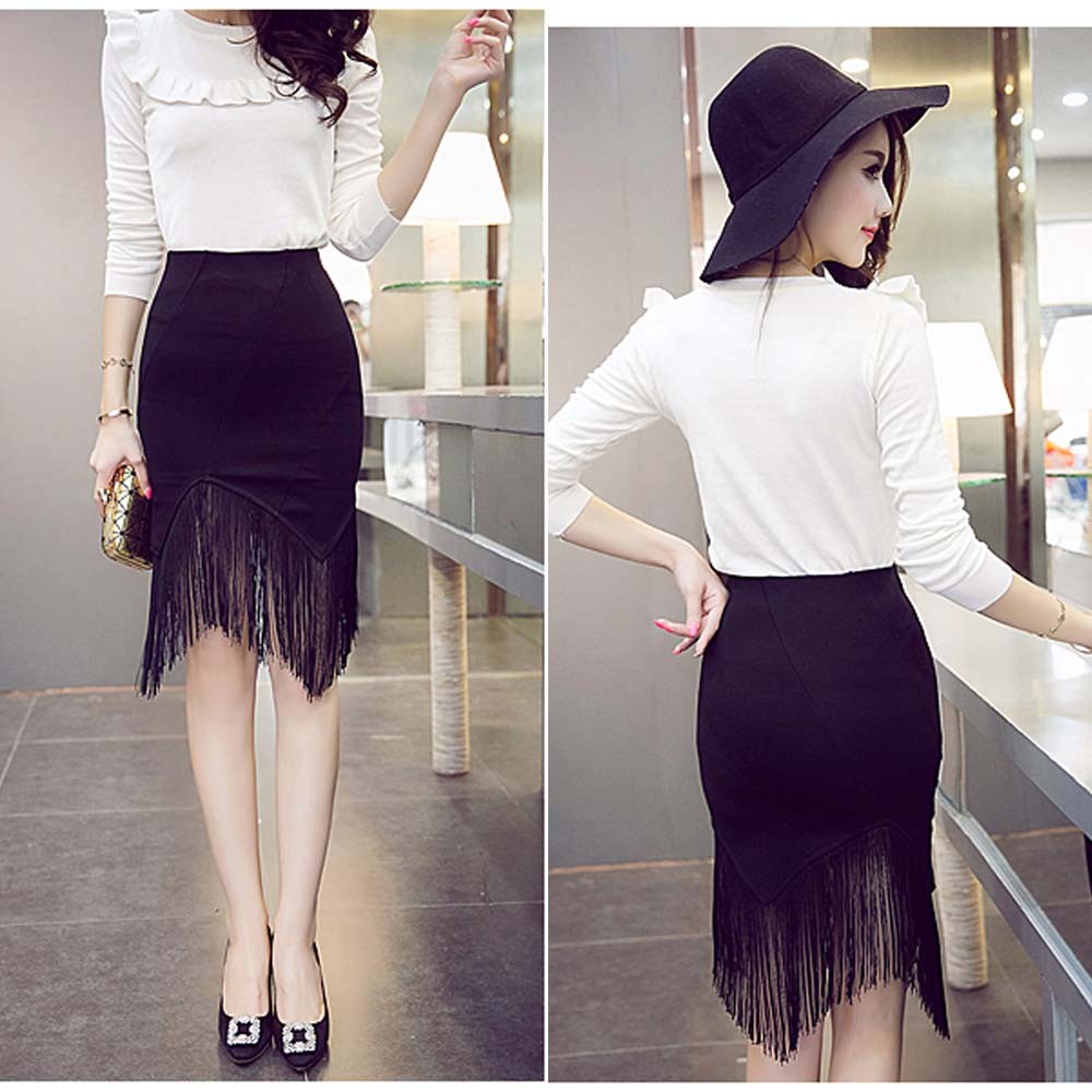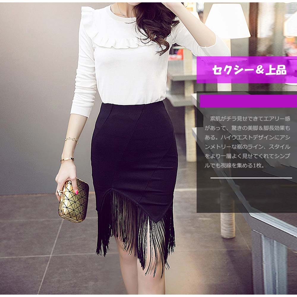 ミニ丈に裾フリンジを加えてまるで膝丈のようにセクシーでも上品なタイトスカート