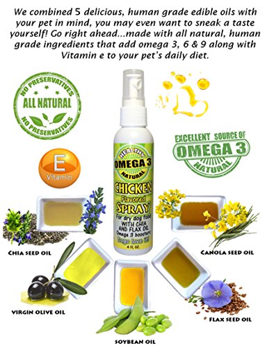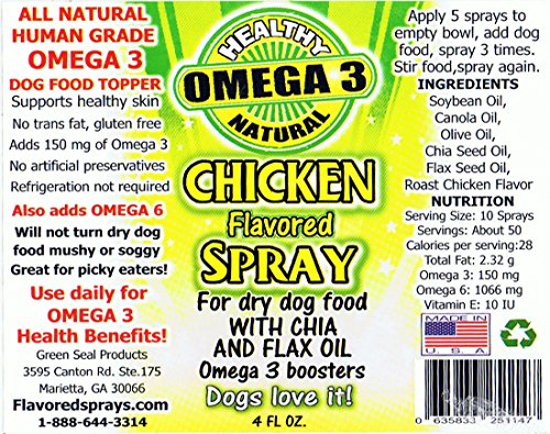 -. Binding : Misc. -. Brand : Flavored Sprays -. EAN : 0635833251147 -. Feature : SUPPORTS HEALTHY AND SHINY SKIN & COAT / Awesome Omega 3 fish oil alternative for dogs and cats. / Helps improve the look and feel of your dog's skin and coat - softens skin and makes it less dry! / Eliminates the odors common to most fish oil based omega-3 oils! / Applies with our easy to use sprayer. Gives you total control of the application of the dog food topper to the dog food kibble. -. Label : Green Seal Products -. Manufacturer : Green Seal Products -. Model : CHK4 -. MPN : CHK4 -. PackageQuantity : 1 -. PartNumber : CHK4 -. ProductGroup : Pet Products -. ProductTypeName : PET_SUPPLIES -. Publisher : Green Seal Products -. Size : 4 oz -. Studio : Green Seal Products -. Title : Chicken Flavor Spray 4 oz -. UPC : 635833251147