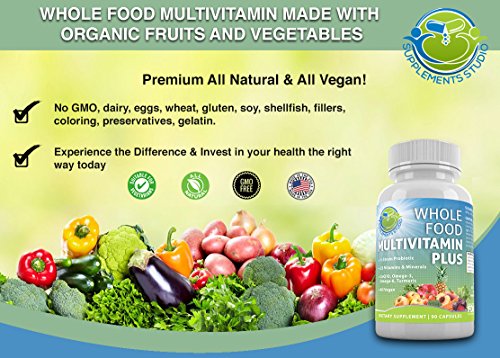 WHOLE FOOD MULTIVITAMIN MADE WITH ORGANIC FRUITS AND VEGETABLES - Premium All Natural & All Vegan - No GMO, dairy, eggs, wheat, gluten, soy, shellfish, fillers, coloring, preservatives, gelatin. Experience the Difference & Invest in your health the right way today - Made in USA