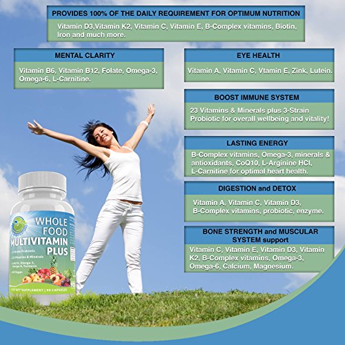 Tired of taking multiple vitamins and pills on a daily basis, just to get the bare minimum your body needs for optimal health? Well, look no more! Our Daily Whole Food Multivitamin Plus is all you need to meet your daily intake of vitamins and minerals in just 1 Daily Dose! Complete multi-system support containing all the necessary vitamins and minerals your body needs for Optimal Health. Vital support of bones, immune system support, heart support and brain support. All vital vitamins A, B, C, D, K, CoQ10, L-Arginine HCL L-Carnitine, Probiotics, Minerals and Turmeric. NO ARTIFICIAL INGREDIENTS, COLORING, OR FLAVORING. NO PRESERVATIVES, GMO, GLUTEN, WHEAT, NUTS, MILK, EGGS, SHELLFISH, SOY, GELATIN. Try Out Our Supplement NOW, Feel the Amazing Results Yourself and get a bottle for the One You Love. Invest in Your Health Today! Click Add to Cart While Supplies Last!Feature