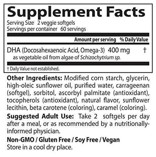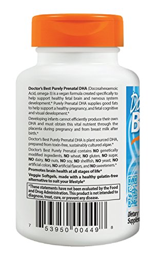 Doctor's best purely prenatal dha (docosahexaenoic acid, omega-3) is a vegan formula created specifically to help support healthy fetal brain and nervous system development. Purely prenatal dha supplies good fats to help support a healthy pregnancy, and fetal cognitive and visual development. Developing infants cannot efficiently produce their own dha and must obtain this vital nutrient through the placenta during pregnancy and from breast milk after birth. Doctor's best purely prenatal dha is plant sourced dha, prepared from toxin-free, sustainably cultured algae. Doctor's best purely prenatal contains no genetically modified ingredients, no wheat, no gluten, no sugar, no dairy, no nuts, no soy, no shellfish, no yeast, no artificial colors, no artificial flavors, and no sweeteners.Feature
