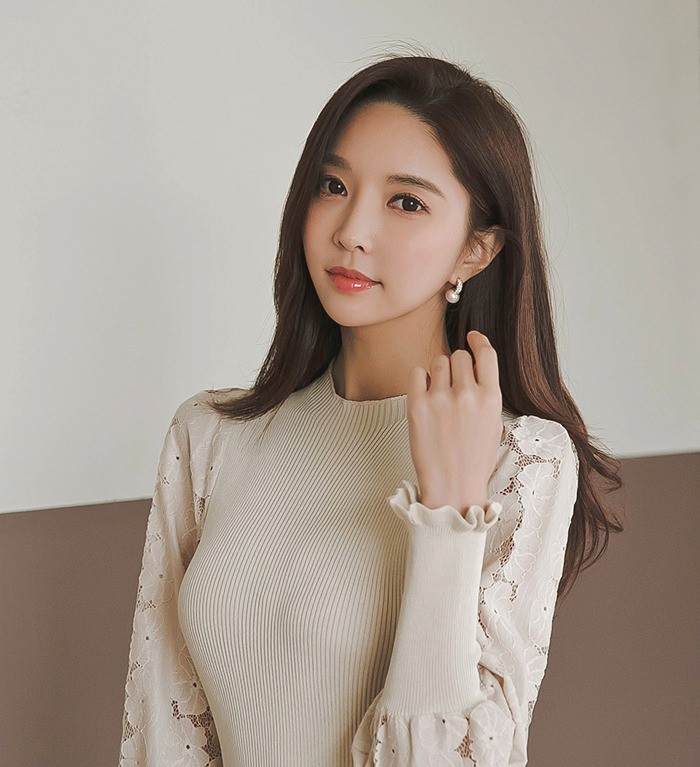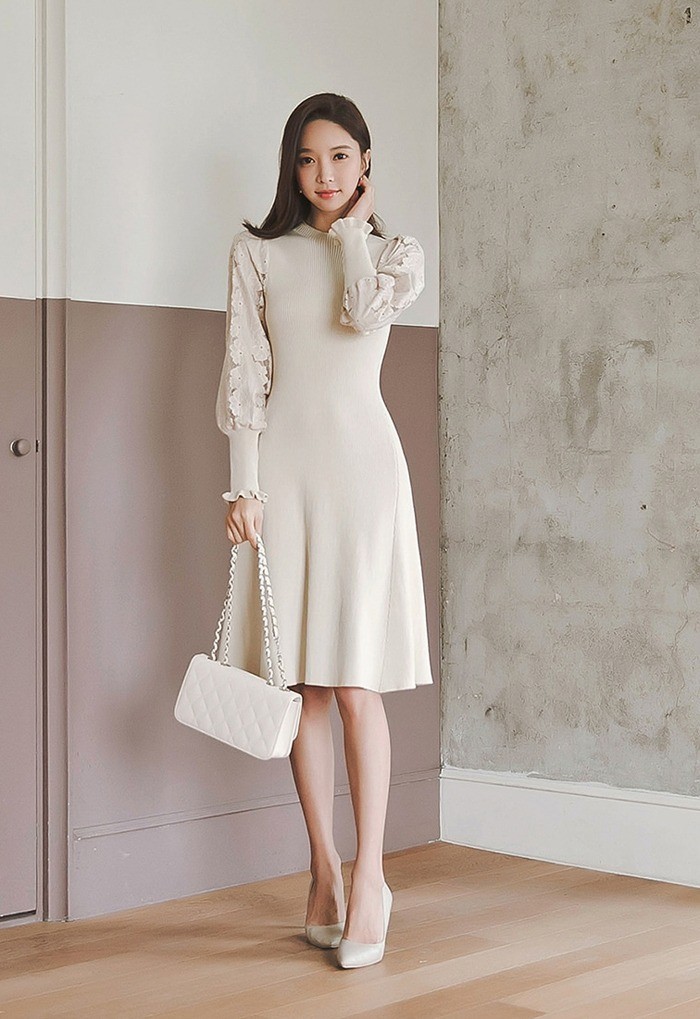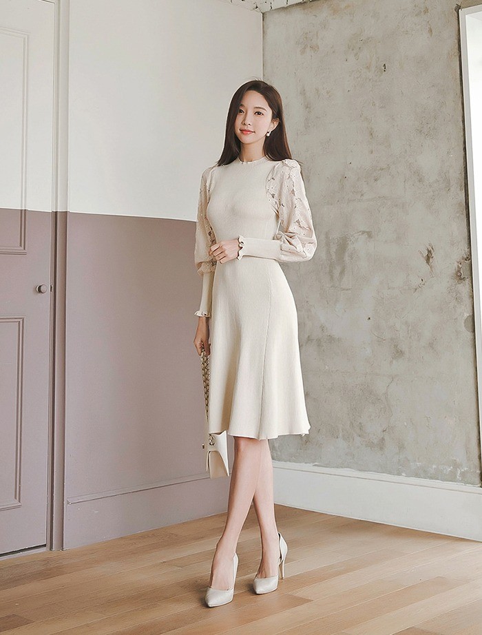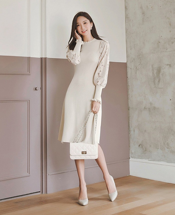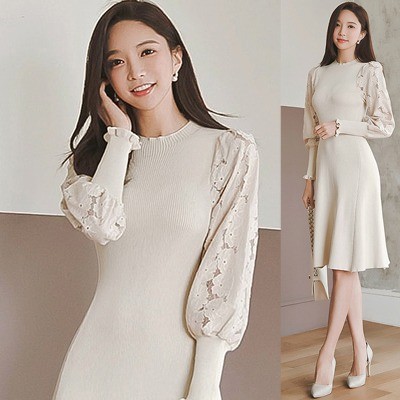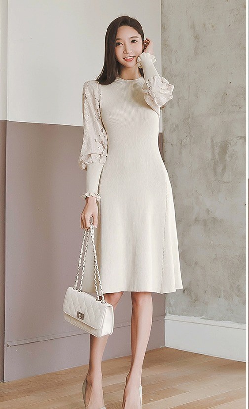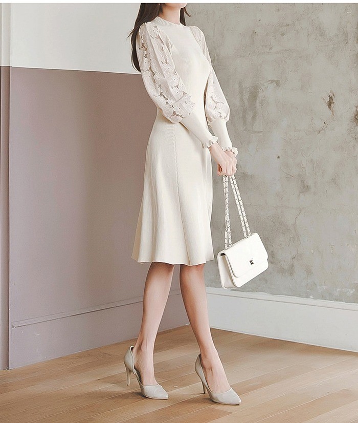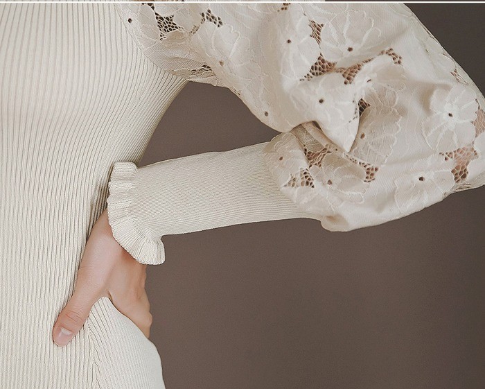 商品名:ワンピース 膝丈 無地 レース袖 ニットワンピース