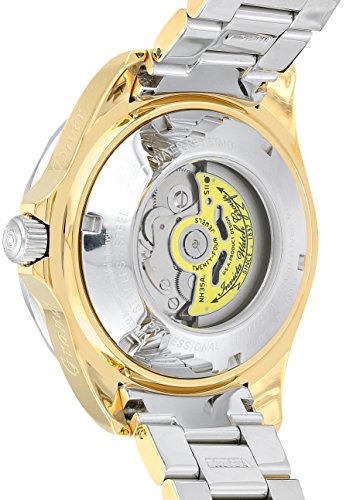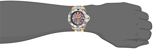 Gold-plated stainless steel case with a two-tone (silver and gold-plated) stainless steel bracelet. Uni-directional rotating bezel. Black mother of pearl dial with luminous gold-tone hands and dot hour markers. Minute markers around the outer rim. Dial Type: Analog. Luminescent hands and markers. Date display at the 3 o'clock position. Automatic movement. Scratch resistant flame fusion crystal. Screw down crown. Transparent case back. Case diameter: 47 mm. Round case shape. Band width: 22 mm. Band length: 8.25 inches. Fold over clasp with safety release. Water resistant at 300 meters / 1000 feet. Functions: date, hour, minute, second. Casual watch style. Invicta Pro Diver Pro Diver Automatic Black Mother of Pearl Two-tone Mens Watch 16034.Feature