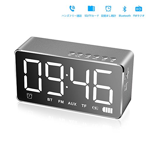 -. Feature : 【多機能装置】:時間表示・デジタルFMラジオ・ワイヤレスBluetoothスピーカー・LED目覚まし時計にアラームとスヌーズ機能・明るさ調整機能も持っています。鏡として使えるし、ハンズフリー機能(Echo Dot)を搭載しているため、着信があってもスマートフォンを取り出すことなく応答することができます。 / 【ポータブルスピーカー】:携帯式と耐用的なデザインで、Bluetoothスパーカーはベッドサイドやリビングルームやテントなどの様々なところで使用できます。いつでもどこでも音楽を楽しめます。 / 【Bluetooth機能】:最新のBluetooth 技術を採用しています。Android、IOS、Windows と互換性があり、スマートフォン、コンピューター、タブレットなど全てのBluetooth搭載機器に対応します。最大接続距離は約10mです。音楽再生することができます。内蔵マイク付きで高品質のハンズフリー通話も実現できます。 / 【大型LEDディスプレイ】:バックライトLCDディスプレイによって、3段LED階の調光できて、時間がはっきり確認できます。鏡面はマルチプロセスによって磨き、明るく、物を反射することができるし、鏡として化粧することができます。 / 【強力なバッテリーの寿命】:4400mAH充電式リチウム電池を内蔵していて、クロックの待機時間は72時間までに達します。USB充電ポートが装備されており、スマートフォンやタブレットや携帯音楽プレーヤーなどの多いスマート電子製品を充電できます。