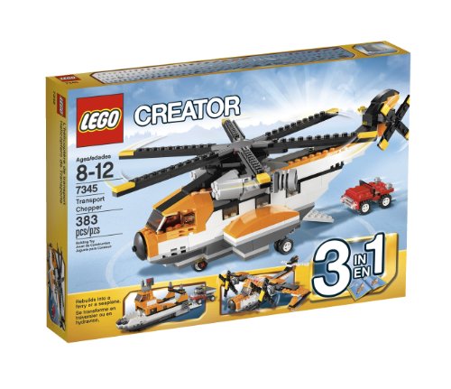 -. Binding : Toy -. Brand : L.E.G.O -. EAN : 0673419167222 -. Feature : Features massive engines, working rotors, opening back ramp and fold-away undercarriage / A great 3-in-1 building experience - rebuild into a seaplane or ferry with truck / Rotate the twin propellers and fold up the pontoons of the seaplane / Fold down the ramp of the ferry to load the truck / Transport Chopper measures over 4" (10cm) high, 3" (9cm) wide and 11" (28cm) long -. Genre : Other -. IsAdultProduct : 0 -. IsAutographed : 0 -. IsMemorabilia : 0 -. ItemPartNumber : 4654038 -. Label : L.E.G.O Creator -. LegalDisclaimer : CHOKING HAZARD -- Small parts. Not for children under 3 yrs. -. Manufacturer : L.E.G.O Creator -. Model : 4654038 -. MPN : 7345 -. PackageQuantity : 1 -. PartNumber : 7345 -. ProductGroup : Toy -. ProductTypeName : TOYS_AND_GAMES -. Publisher : L.E.G.O Creator -. SKU : LGO7345F -. Studio : L.E.G.O Creator -. Title : L.E.G.O Creator 7345 Transport Chopper -. UPC : 673419000000 -. Warranty : No Warranty