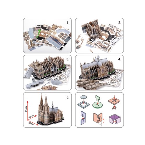 -. Feature : A fun and challenging 3D puzzle of The Cologne Cathedral in Cologne / Constructed using CubicFun's unique slotting system / Difficulty Level: 5 stars ; Number of Pieces: 179 / Construction time: 200 to 220 minutes / Length when completed: 35cm