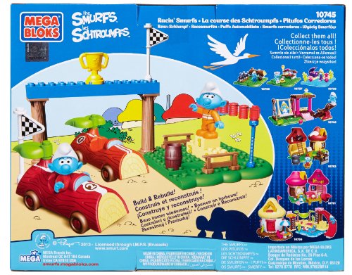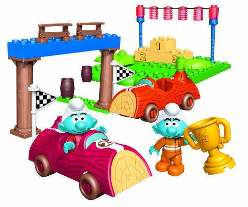 -. Feature : Build and rebuild the SmurfTM Race. Includes green building plate for easy and secure building / Includes two buildable racing cars and two SmurfsTM in racing suits / Includes audience bridge, checkered flags, obstacle barrels, podium with celebratory lights and winner's trophy / Fun on its own or combine with other SmurfTM characters and playsets by Mega Bloks / Suitable for age start from 4, Contains: 29PCs