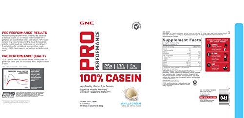 -. Binding : Health and Beauty -. Brand : GNC -. Feature : High-Quality, Gluten Free Protein / Supports Muscle Recovery With Slow-Digesting Protein / Pro Performance Results / Maintaining AdE.q.u.a.t.e Protein Levels Throughout The Day Can Be A Challenge. Casein Is A Slow-Release Protein Naturally Rich In Glutamine And Branched Chain Amino Acids (Bcaa). 100% Casein Contains 25 Grams Of Protein, Providing Slow And Steady Amino Acids For Muscle Growth And Maintenance Over Several Hours.A Perfect Choice For Overnight And Long-Period Lean Muscle Recovery. 100% Casein Supports Your Wellness And Performance Goals. / Pro Performance Quality -. ProductGroup : Health and Beauty -. ProductTypeName : HEALTH_PERSONAL_CARE -. Title : GNC Pro Performance 100 Casein Protein - Vanilla Cream 2.1 lbs.