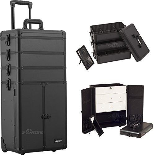 Sunrise I3366PPAB Black Matte Professional Rolling Aluminum Cosmetic Makeup Craft Storage Organizer Case French Door Opening with Large Drawers and Stackable Trays with Dividers