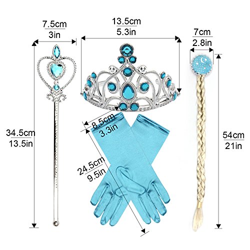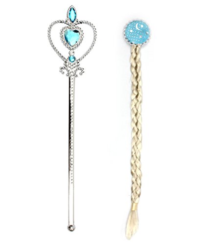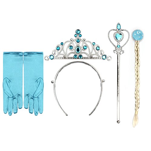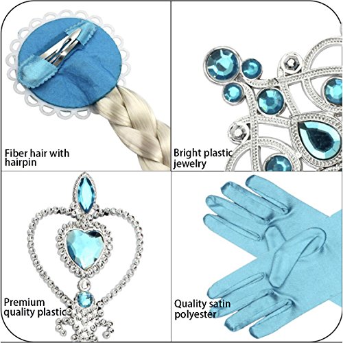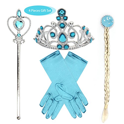 Fedio adorable princess dress up comes in 4 Pcs. Cute and quality fiber hair braid; A pair of soft satin gloves; Bright and beautiful princess tiara crown and wand. This cute set is a excellent gift for you little princess.