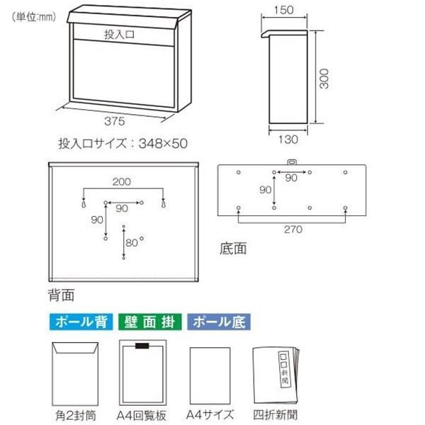 門扉や壁に掛けるタイプのおしゃれカラーポスト。A4用封筒やA4回覧板の大型郵便物がらくらく投函。ダイヤル錠付で防犯性にも優れています。前入れ前出し仕様のポストです。 |