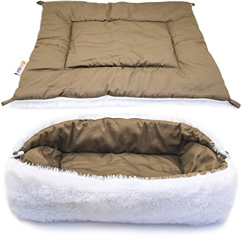 This multifunctional bed mat is appropriate for cats, kittens, puppies and small dogs. The size of the mat is 24-inch x 20-inch and the diameter of the bed is 15-inch. You can easily wash it in the washing machine. It is very lightweight so you can use it for traveling, in a carrier or in the car. Otherwise, use it on your pet's favorite place, on the bed, couch, chair, the floor, the windowsill or anywhere you wish to protect the furniture from pet hair for a fur-free home. You can choose between two comfortable sides. The white, warm furry side is for cold winter days and the brown, natural 100% cotton side is for hot summer days. Your loved ones can choose between 5 different positions for sleep, rest and play! Use this bed/mat in many ways for chilling and sleeping: - as a mat - folded into a bed - folded into a canoe For play and hide use it as: - a tent - a tunnel And do not forget, it is not only comfy for your cat but also looks amazing at your home! You will receive the Pettsie bed/mat in a natural carton box. It is a wonderful gift idea for all cat lovers. Click "Add to Cart" and order the bed/mat today! Do not forget to surprise your friends also. 0 |