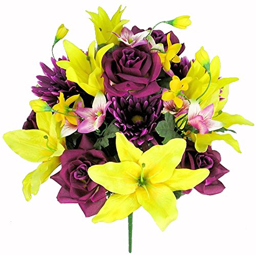 Admired By Nature 2 Artificial Lily, Rose, Gerbera Flower Mixed Bush with Greenery for Home, Wedding, Restaurant & Office Decoration Arrangement, Violet/Yellow, 18 Stems- 2 Pieces