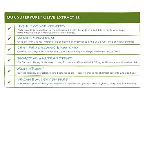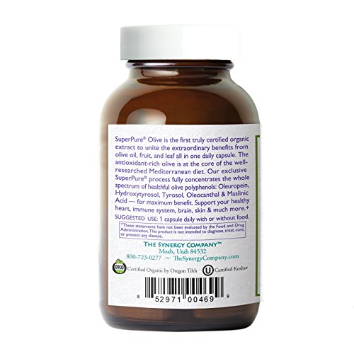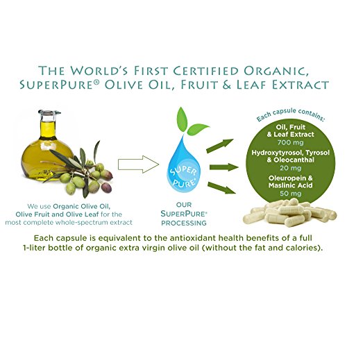 SuperPure Olive is the first truly certified organic extract to unite the extraordinary benefits from olive oil, olive fruit, and olive leaf all in one daily capsule. The antioxidant-rich olive is at the core of the well-researched, heart-healthy Mediterranean diet. Our exclusive SuperPure process fully concentrates the whole spectrum of olives' amazingly healthful compounds-oleuropein, tyrosol and hydroxytyrosol-for maximum benefits. Support your healthy heart, immune system, brain, skin & much more.Feature