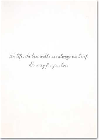 Studio : Avanti Press Publisher : Avanti Press Binding : Health and Beauty Product Description The interior of this Avanti Press David Wisse, Chris Rogers pet sympathy card reads: In life, the best walks are always too brief. So sorry for your loss. The card measures 4.7x6.6 inches and is printed on recycled heavy cardstock. Includes 1 card and 1 envelope. The card has the following special features: recycled paper. Made in the USA. 0