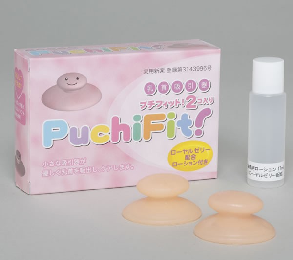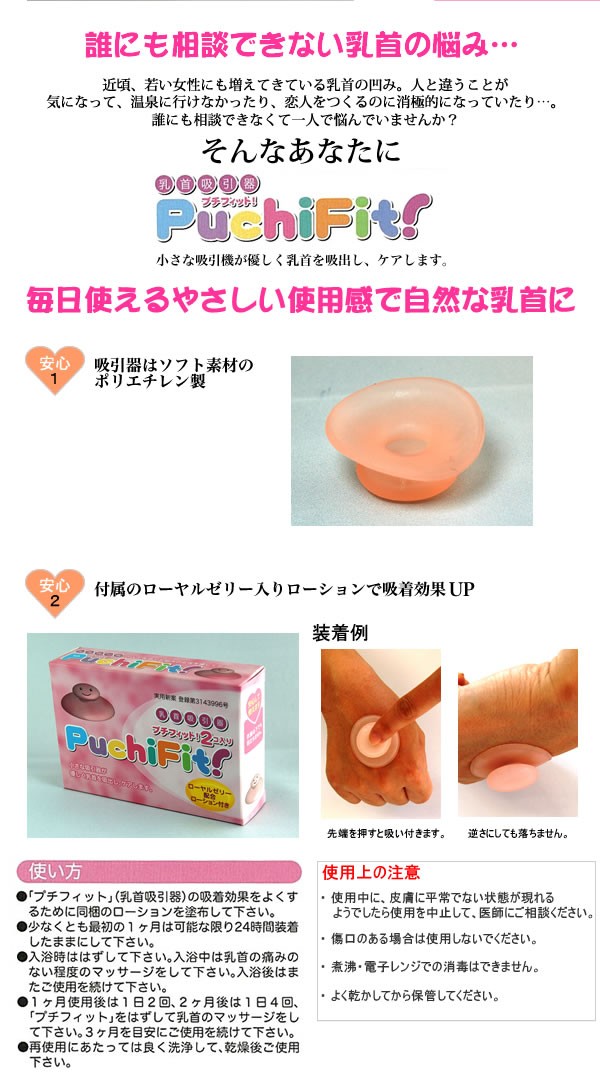 | 誰にも相談できない乳首の凹み。プチフィットにまかせて!ソフト素材の吸引器で乳首を吸出し、ケアします。衣服の下でも目立たず、24時間つけたままでOK。付属のローションをつければ吸着力もUP |