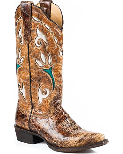 Studio : Stetson Boots Publisher : Stetson Boots Binding : Shoes Product Description Vintage Brown Vamp Gold 13 Shaft With Tulip Underlay Handmade Cowboy Boot Snip Toe Single Welt All Leather Sole Stacked Heel Lemonwood Peg and Brass Nail Construction All Leather Lining Lightly Cushioned Leather Insole 0