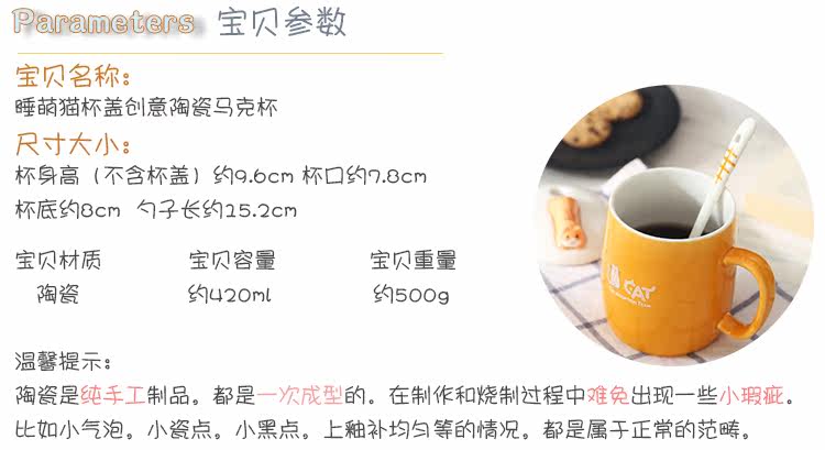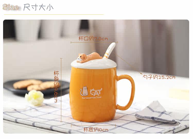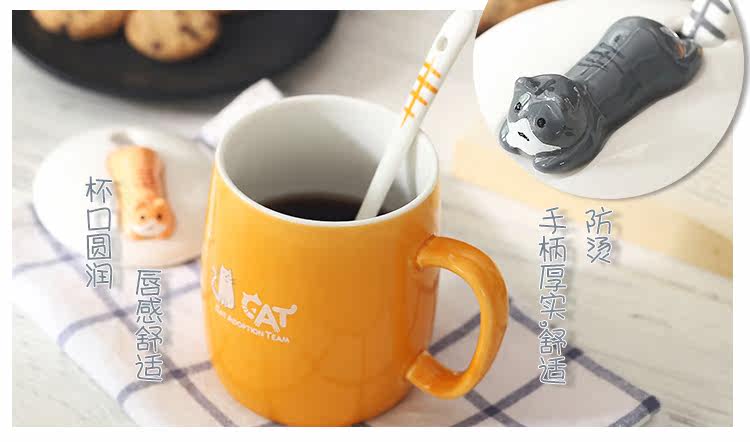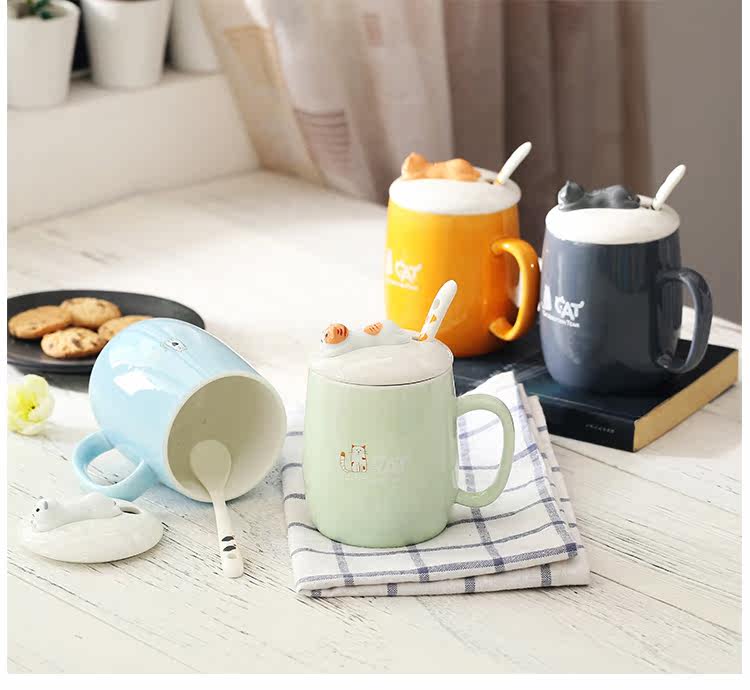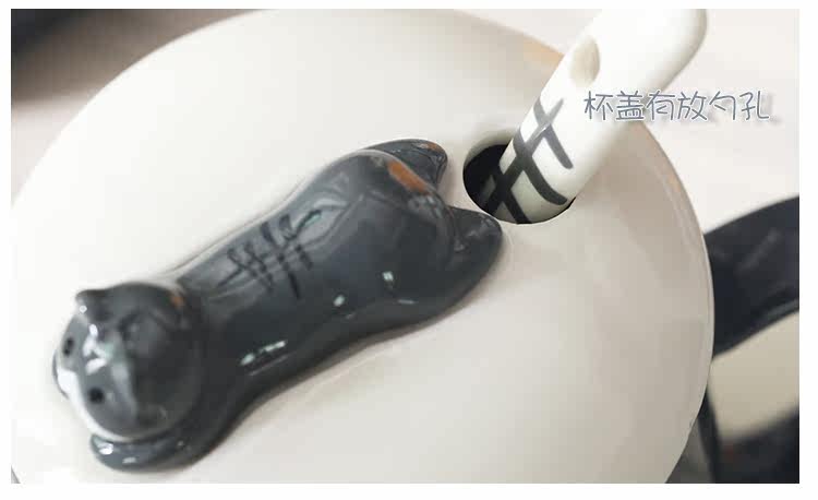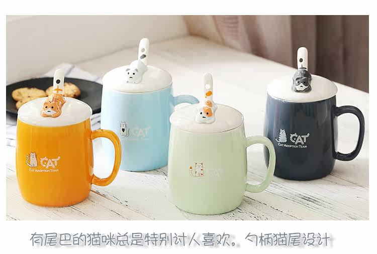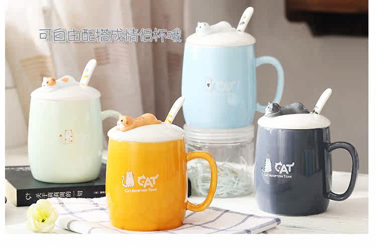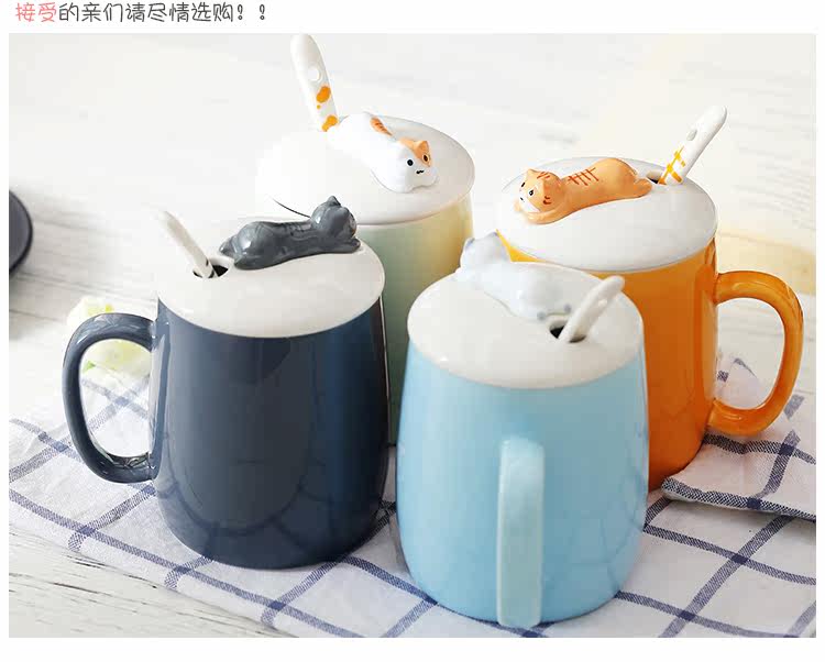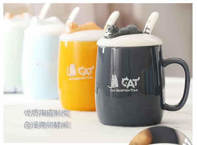 可爱猫咪个性陶瓷杯子带盖勺陶瓷马克杯办公室水杯情侣咖啡牛奶杯
