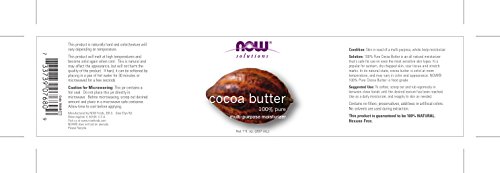 100% Pure Cocoa Butter is an all natural moisturizer that's safe for use on even the most sensitive skin types. It is popular for sunburn, dry chapped skin, scar tissue and stretch marks. In its natural state, cocoa butter is solid at room temperature, and may vary in color and appearance. This product is naturally hard and color/texture will vary depending on temperature. Contains no fillers, preservatives, additives or artificial colors. No solvents are used during extraction. This product is guaranteed to be 100% NATURAL. NOW does not test on animals.Feature