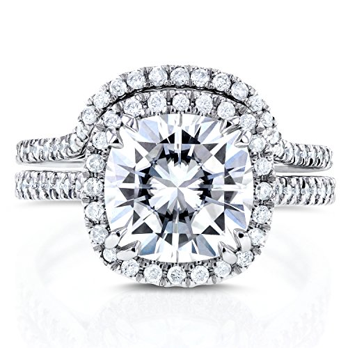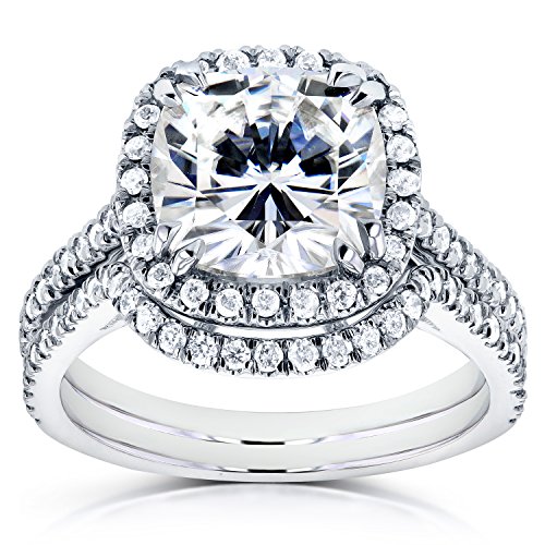 -. Title : Cushion Moissanite and Halo Diamond Bridal Set 3 1/4 CTW in 14k White Gold