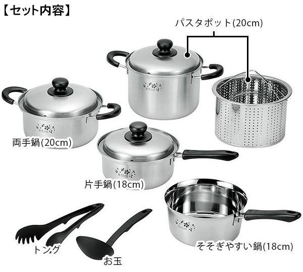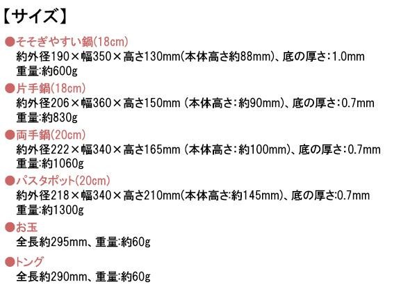 | 素材・材質 | そそぎやすい鍋:ステンレス鋼 片手鍋・両手鍋・パスタポット:18-0ステンレス お玉・トング:66ナイロン |
