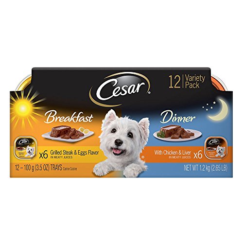 • Contains twelve (12) 3.5-oz. trays of CESAR SUNRISE Breakfast and Dinner Mealtime Variety Pack Dog Food including (6) Grilled Steak & Eggs Flavor and (6) With Chicken & Liver