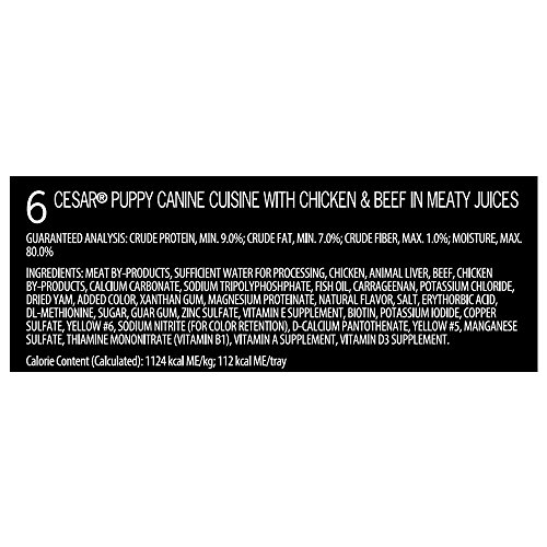 • CESAR Canine Cuisine Trays feature a delectable variety of chicken, beef and lamb flavors in meaty juices for puppies