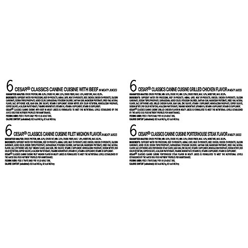 • Contains (2) cases of (12) 3.5-oz. trays (24 servings total) of CESAR Canine Cuisine Variety Pack Dog Food: (6) Filet Mignon Flavor; (6) Porterhouse Steak Flavor
