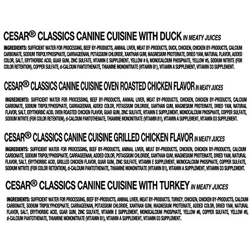 • Contains (24) 3.5-oz. trays of CESAR Canine Cuisine Poultry Variety Pack Dog Food including (6) With Duck, (6) Grilled Chicken Flavor, (6) Oven Roasted Chicken Flavor and (6) With Turkey
