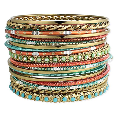 Get ready for festival season with this set of 22 stacking bangles! Golden hued metals with turquoise, coral and green accents come in a variety of styles and texture. Lead free gold toned base metal. Zad Jewelry. Product Dimensions: 2-3/4-inches in diameter; stack measures approximately 1-3/4-inch wide.Feature