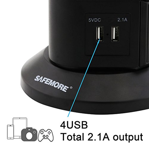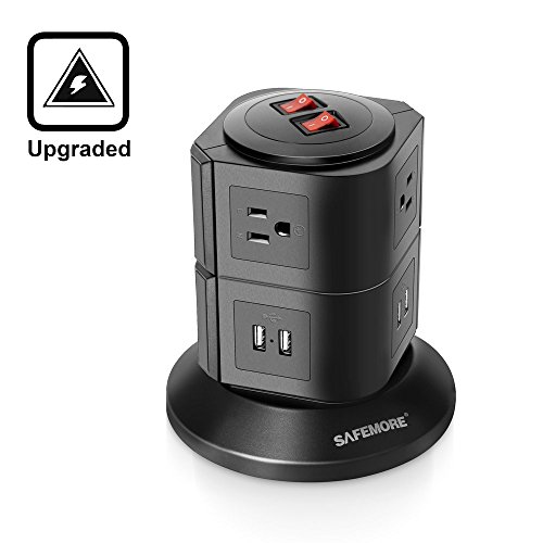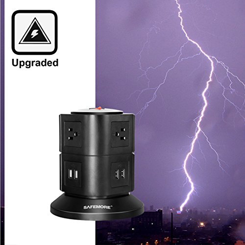 [Upgrade Version] Safemore More Safer Double Pole Switch AWG14 6.5 Feet Long Cord with 6 Outlet 4 USB Smart Tower Power Socket Surge Protector Power Strip (Black)