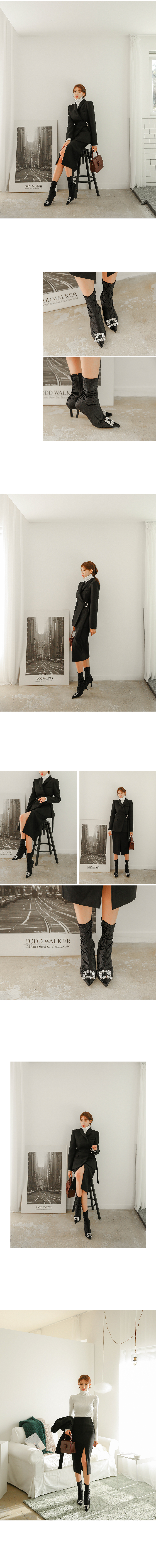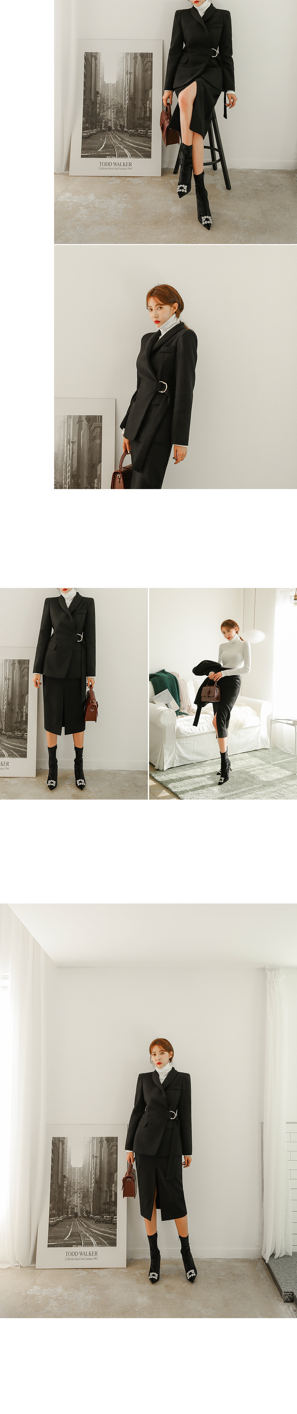 클래식한 무드로 같은 소재의 자켓과