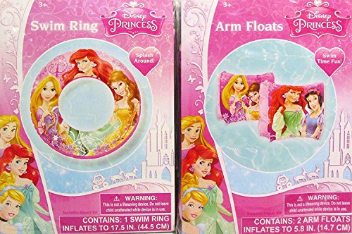 What Kids Want! Disney Princess Swim Ring and Arm Floats for Children Age 3+ Splash Around and enjoy at the Pool! Swim Ring - inflates to 17.5 inches (44.5 cm). Swim time Fun! Arm Floats inflate to 5.8 inches (14.7 cm). Includes a Vinyl Plastic Repair Kit. Warning: This is not a lifesaving device. Do not leave child unattended while device is in use. Some sunscreens can cause ink on this product to run. Only to be used in water which the child is within its depth and under supervision. Distributed by: Dolgencorp, LLC