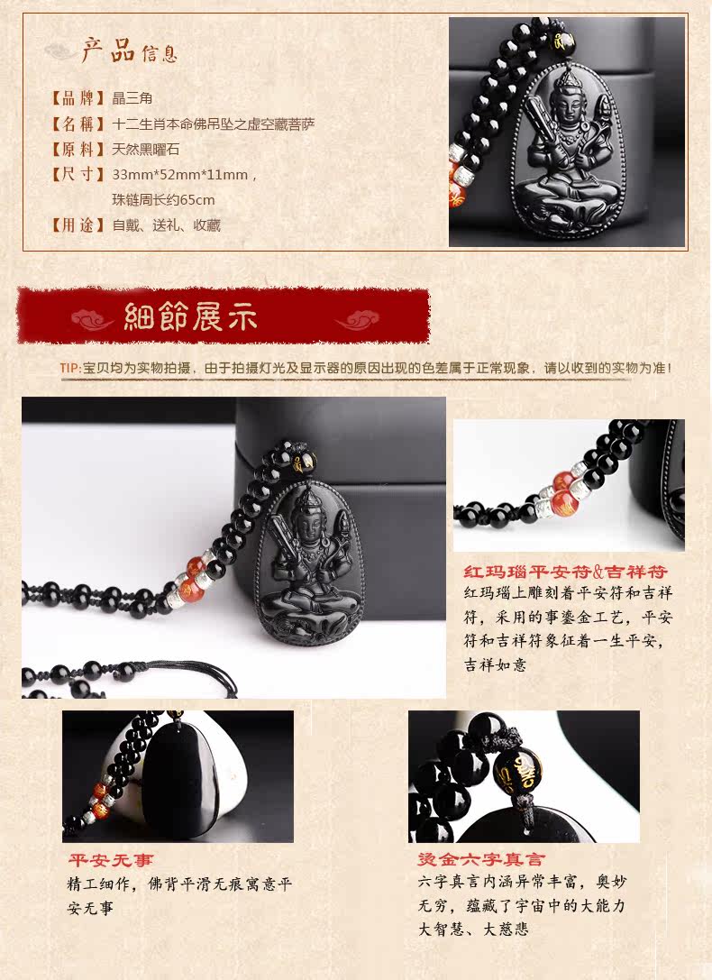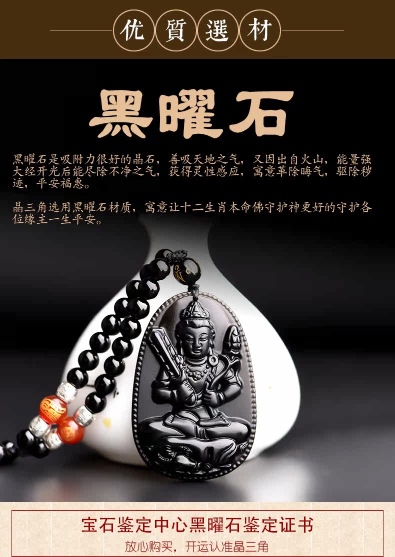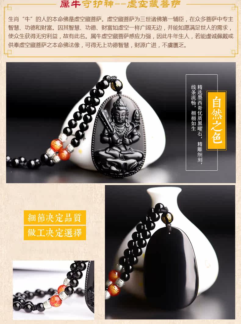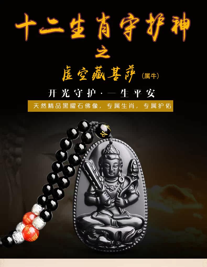 开光天然黑曜石虚空藏菩萨吊坠 生肖牛守护神本命佛项链男女饰品